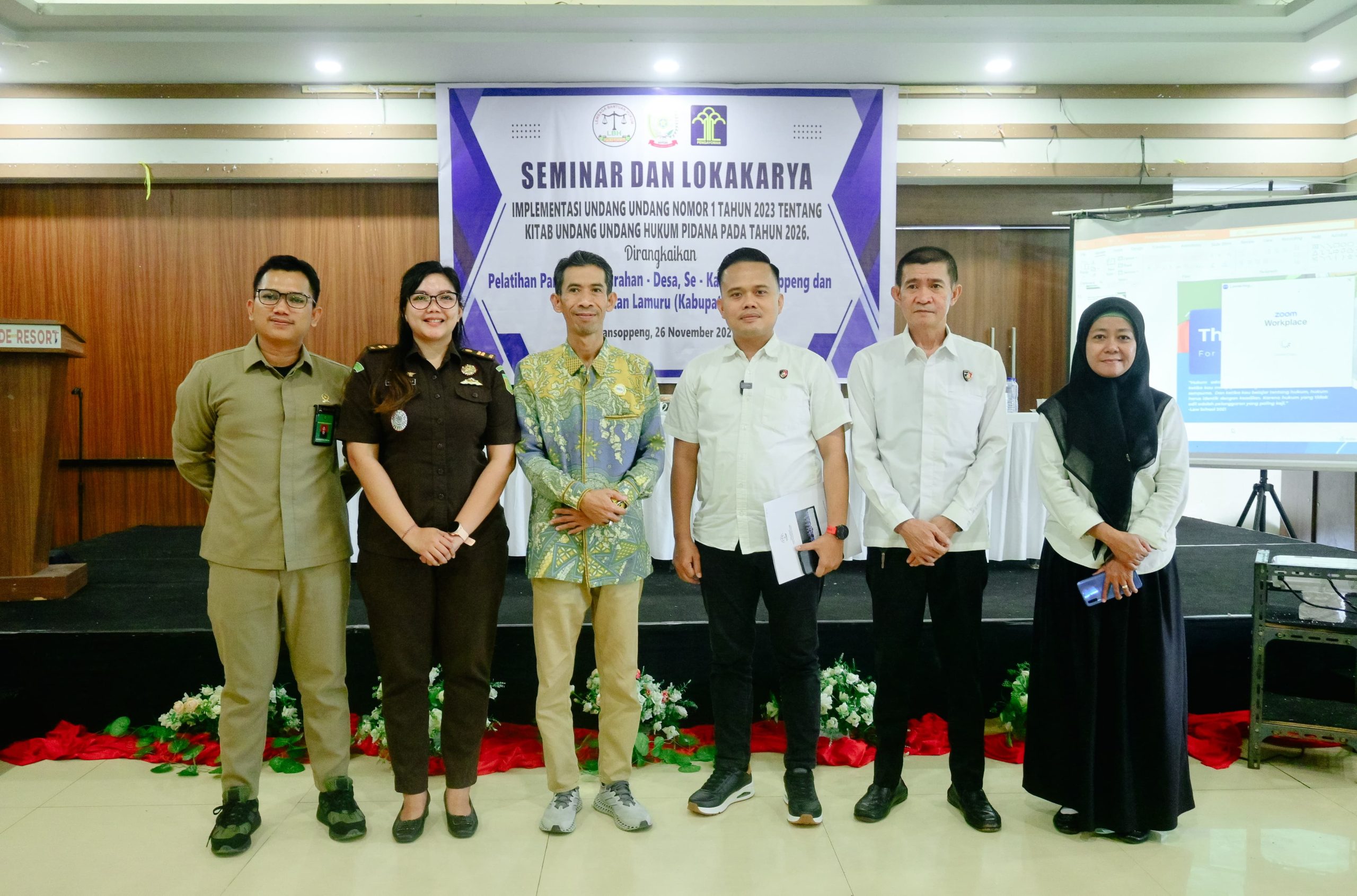 Para narasumber dan peserta seminar berfoto bersama usai sesi pemaparan materi mengenai implementasi KUHP 2023 di Gedung Tripel 8 Watansoppeng.