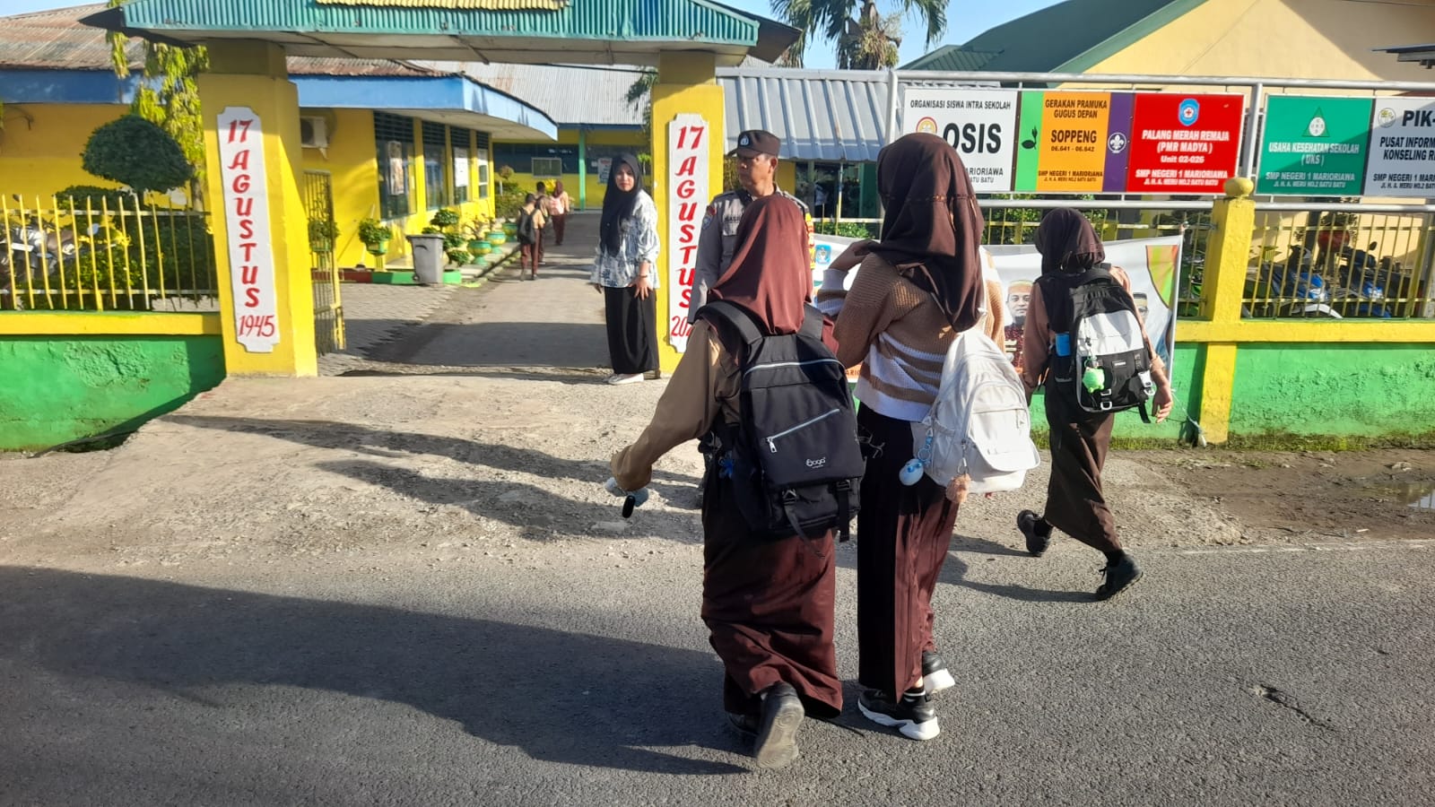 Para pelajar memasuki halaman sekolah di pagi hari, sementara anggota Polsek Marioriawa membantu mengatur arus kendaraan dan menjaga keamanan di sekitar area sekolah.