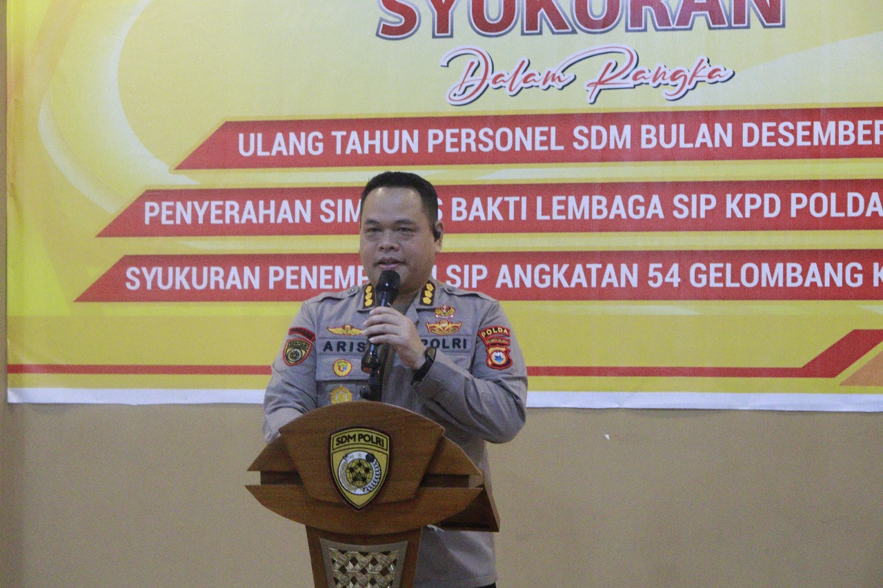 Karo SDM Polda Sulsel Kombes Pol Aris Haryanto, SIK, M.Si menyampaikan sambutan dalam kegiatan syukuran ulang tahun personel Biro SDM periode Desember 2025 yang dirangkaikan dengan pengantar tugas lulusan SIP Angkatan 54.2 Polda Sulsel di Sasana Beladiri Appatuju Polda Sulsel.