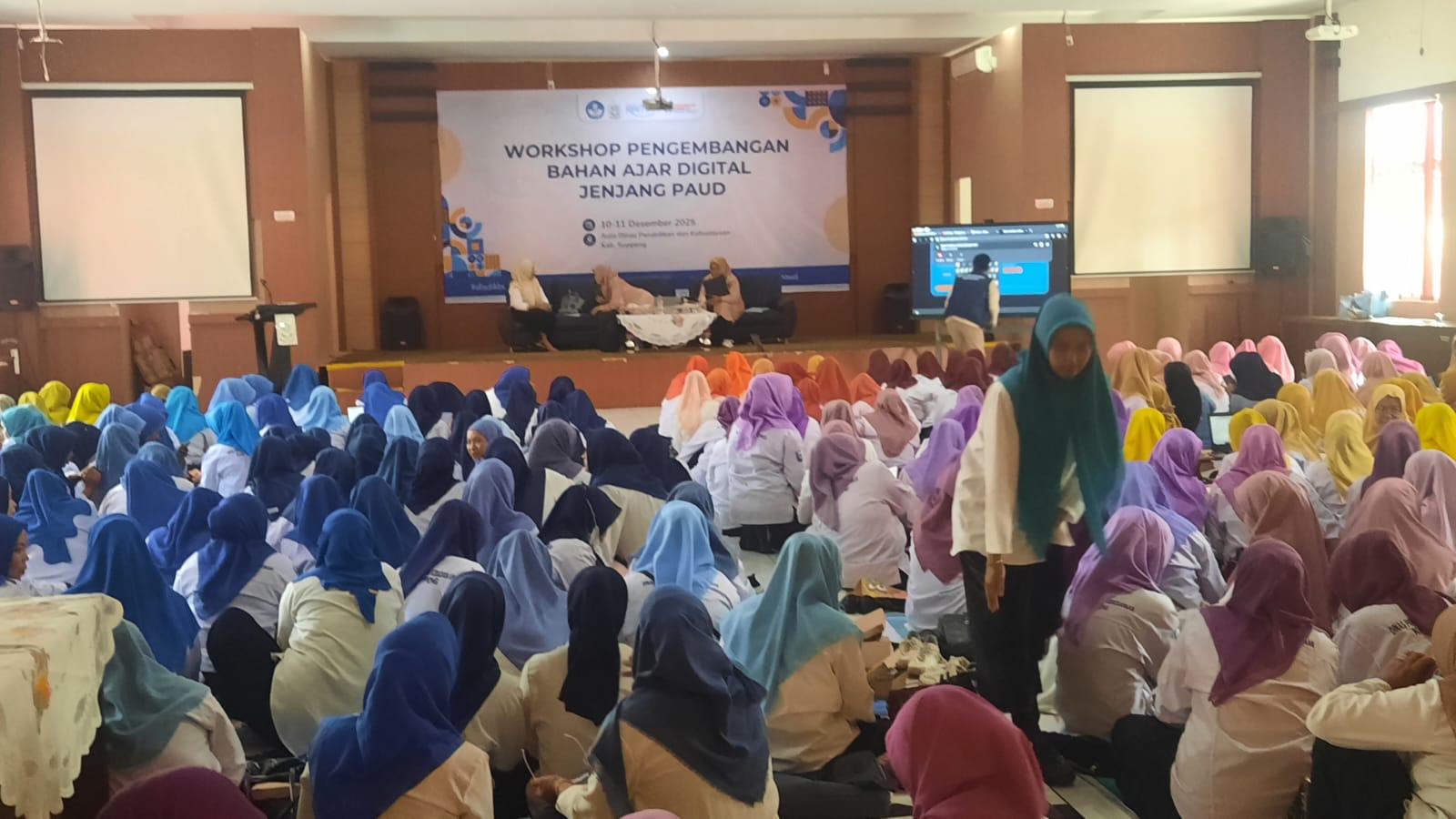 Sebanyak 312 guru PAUD, dari TK hingga TPA, duduk bersila, sebagian menunduk mencatat, sebagian lain memandang layar dan panggung dengan mata yang penuh tanya.
