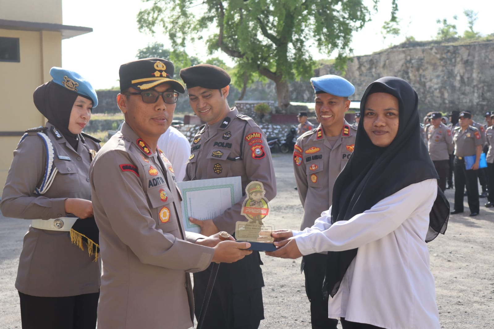 Kapolres Soppeng AKBP Aditya Pradana, S.I.K., M.I.K., menyerahkan piagam penghargaan kepada salah satu personel penerima reward Kategori Sangat Disiplin Tahun 2025 usai apel pagi di halaman Mapolres Soppeng, Senin (29/12/2025).