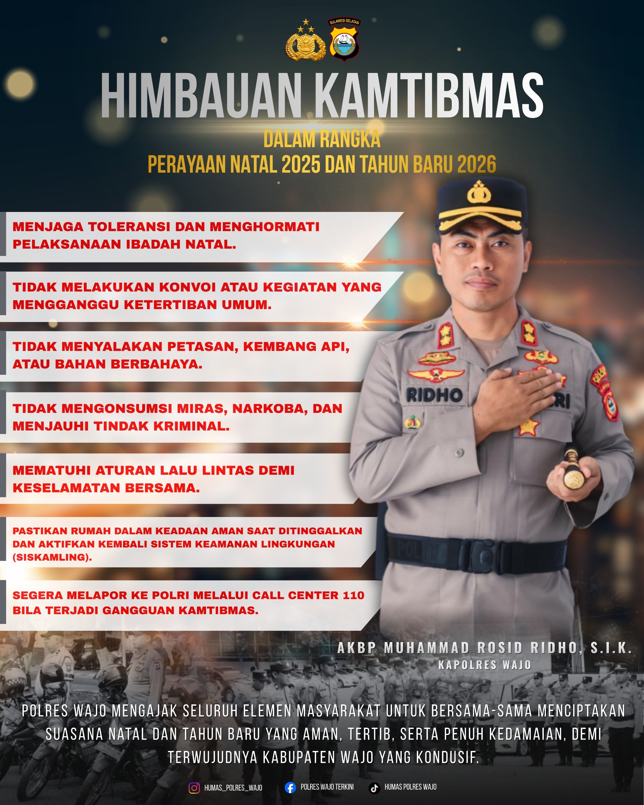 Kapolres Wajo AKBP Muhammad Rosid Ridho, S.I.K., menyampaikan imbauan kamtibmas menjelang perayaan Natal 2025 dan Tahun Baru 2026, mengajak masyarakat menjaga toleransi, ketertiban, serta keamanan demi terciptanya Wajo yang aman dan damai.