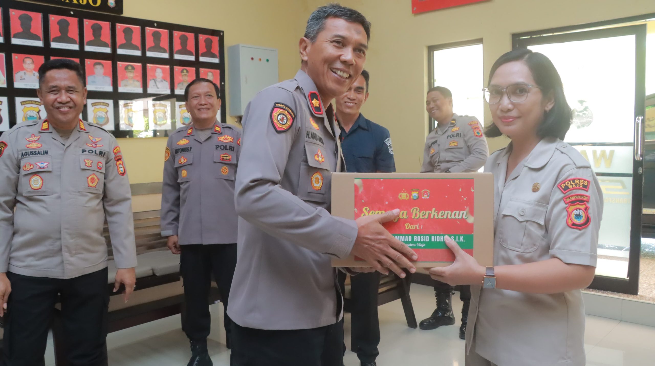 Kapolres Wajo AKBP Muhammad Rosid Ridho, S.I.K., menyerahkan bingkisan Natal kepada personel Polres Wajo yang beragama Nasrani di Lobby Mapolres Wajo, Selasa (23/12/2025), sebagai simbol relasi negara dan iman dalam tubuh institusi kepolisian.