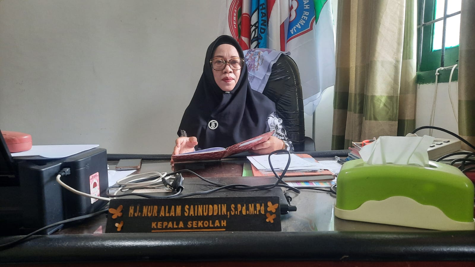 Kepala SMP Negeri 2 Marioriwawo, Hj. Nur Alam Sainuddin, S.Pd., M.Pd., di ruang kerjanya, menyampaikan pandangannya tentang peran guru dan orang tua dalam membentuk karakter siswa—sebuah ikhtiar sunyi di tengah rutinitas pendidikan. (Foto: Syukur Mariorante Katalawala)