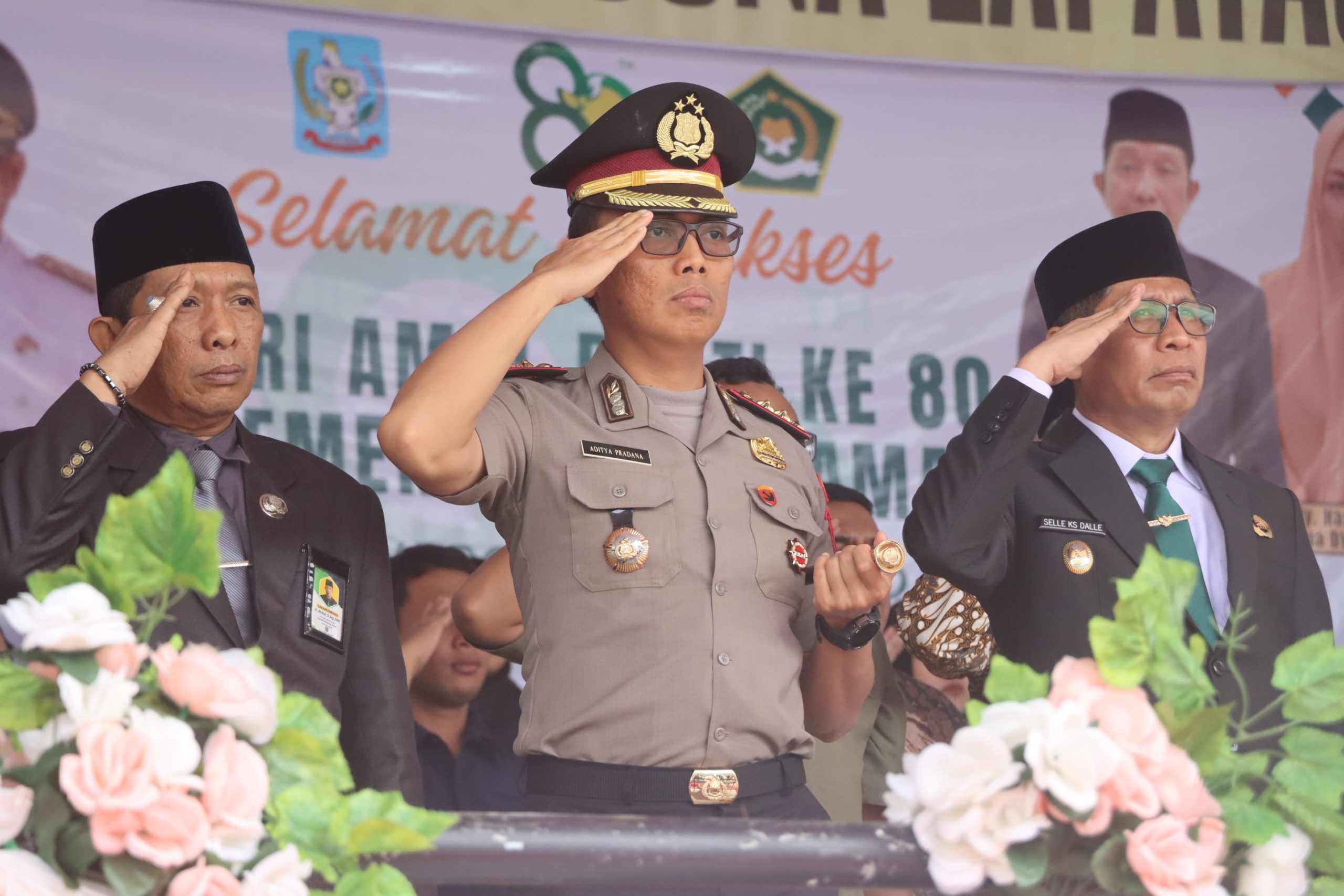Kapolres Soppeng AKBP Aditya Pradana, S.I.K., M.I.K. (tengah) bersama unsur Forkopimda memberikan penghormatan saat Peringatan Hari Amal Bhakti (HAB) ke-80 Kementerian Agama RI di Lapangan Gasis Watansoppeng, Sabtu (3/1/2026).