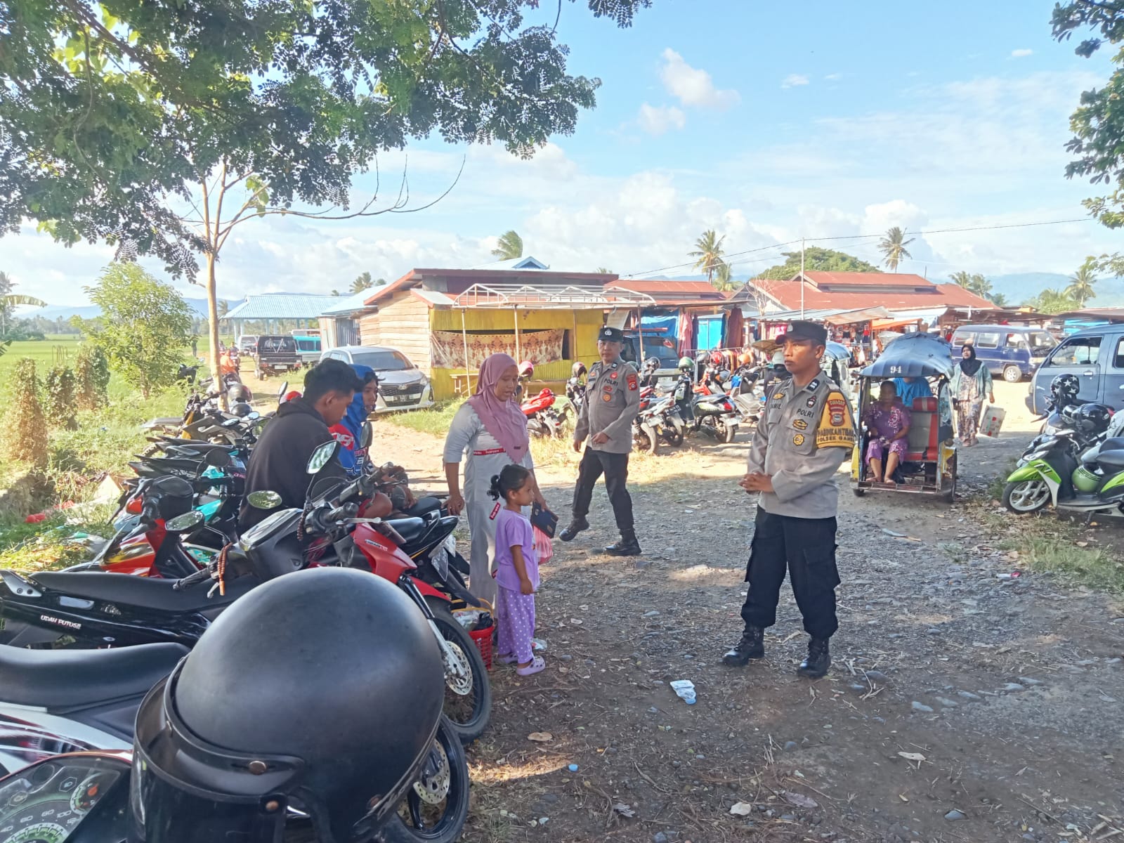 Personel Polsek Ganra dipimpin Bhabinkamtibmas Aipda Jamil, S.H., mengatur arus lalu lintas dan membantu warga di depan Pasar Ganra, Rabu pagi (14/1/2026), demi memastikan aktivitas pasar berjalan aman, tertib, dan lancar.