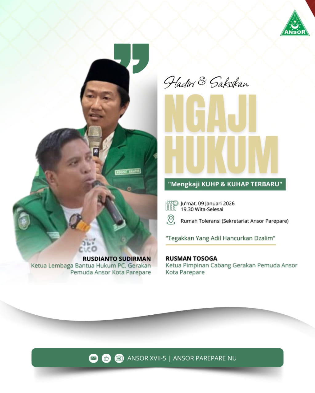 Melalui forum Ngaji KUHP–KUHAP Baru, Ansor Parepare menegaskan satu pesan: hukum tidak boleh kehilangan rasa. Ia harus berpihak pada martabat manusia, diawasi publik, dan dijalankan dengan hati yang bersih. Di Rumah Toleransi itu, hukum belajar kembali menyapa nurani.