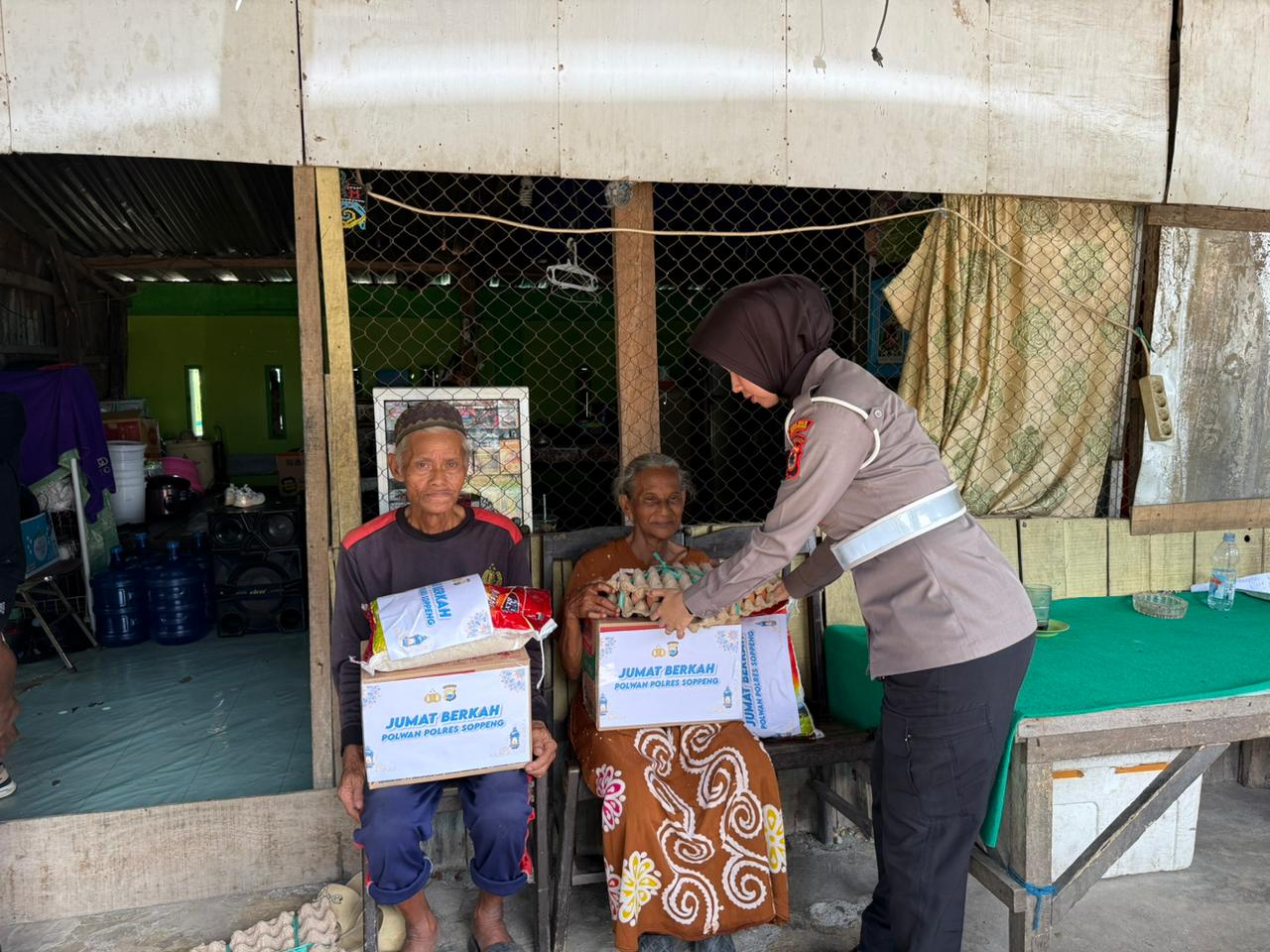 SENTUHAN KEMANUSIAAN: Perwira Polwan Polres Soppeng, IPTU Cietra Ariesta, S.Psi., menyerahkan bantuan kebutuhan pokok kepada seorang warga di Kabupaten Soppeng, Jumat (9/1/2026). Kegiatan ini merupakan bagian dari program Jumat Berkah yang rutin dilaksanakan untuk mempererat kedekatan emosional antara Polri dan masyarakat.