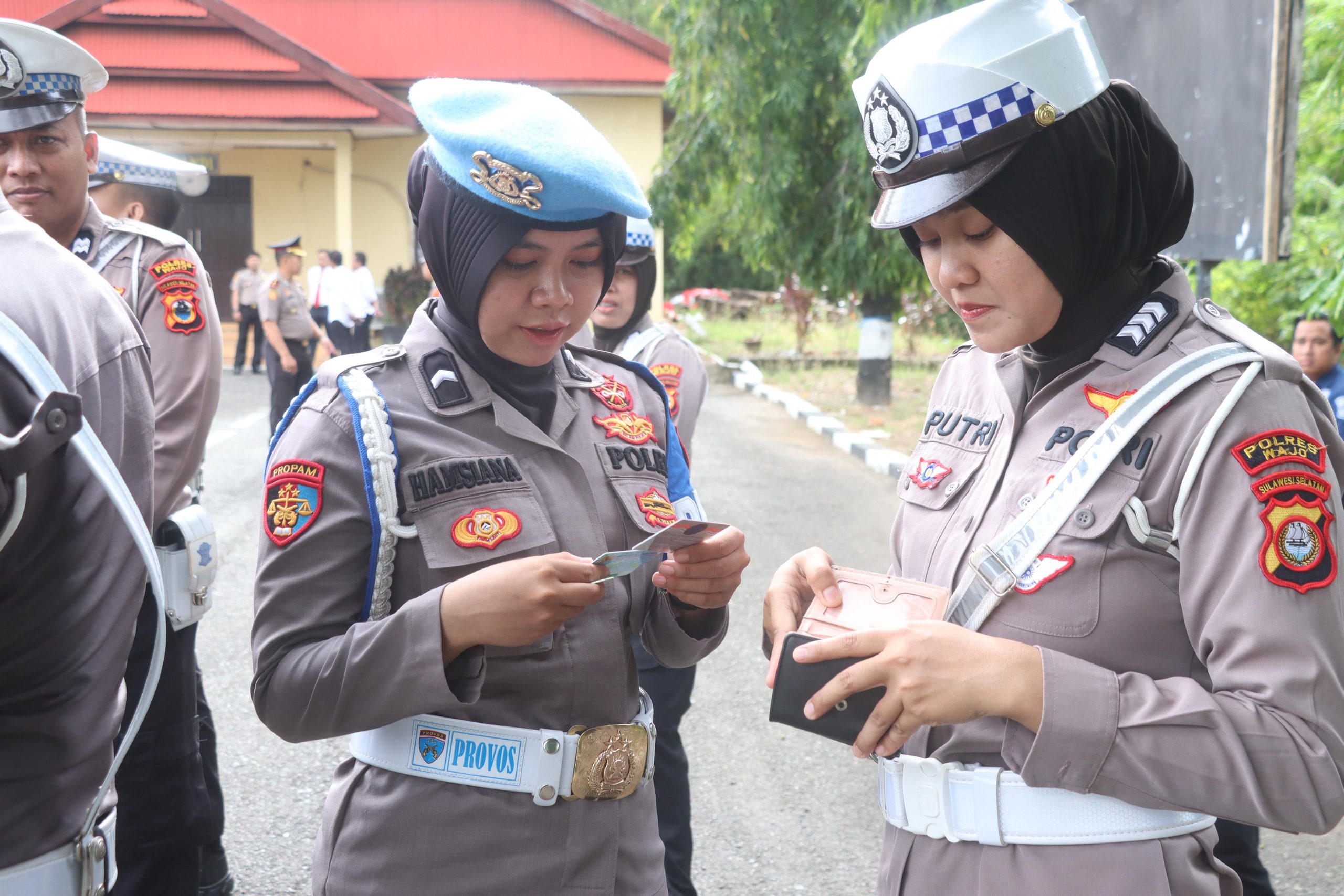 Personel Seksi Propam melakukan pemeriksaan identitas dan kelengkapan administrasi anggota Polwan Sat Lantas saat kegiatan Gaktiblin di halaman Mapolres Wajo, Senin (23/2/2026). Pemeriksaan ini bertujuan memastikan kesiapan, kedisiplinan, dan profesionalisme personel sebelum bertugas melayani masyarakat. (FOTO: HUMAS POLRES WAJO)