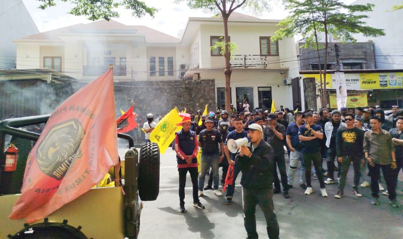 Ratusan warga Soppeng menyampaikan aspirasi di depan Kantor DPD Partai Golkar Sulawesi Selatan, membawa bendera organisasi dan pengeras suara, sebagai ekspresi keresahan atas kegaduhan politik daerah. Aksi ini mencerminkan tuntutan publik akan kejelasan sikap dan tanggung jawab kepemimpinan di tengah krisis kepercayaan yang belum terjawab.