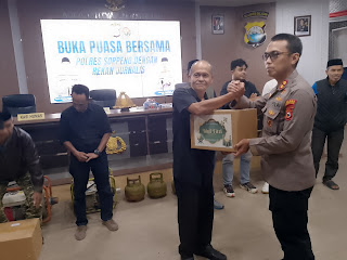 Menjelang waktu berbuka puasa, suasana kegiatan semakin terasa hangat. Polisi dan wartawan duduk bersama menikmati hidangan berbuka yang telah disiapkan.