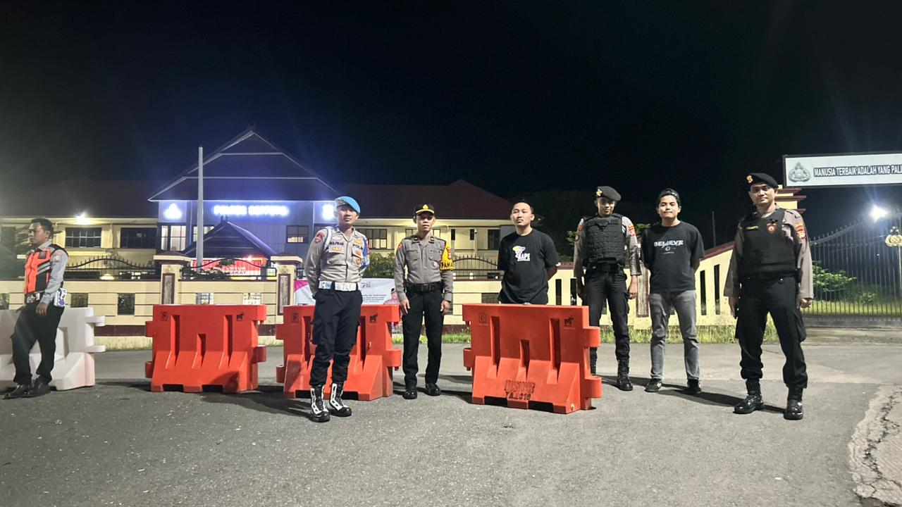 Kapolres Soppeng AKBP Aditya Pradana (tengah-kiri) bersama jajaran, panitia, dan perwakilan pemenang Soppeng Ramadhan Sprint Race 2026, berpose di depan barikade jalan berwarna merah dengan latar belakang Gedung Mapolres Soppeng di keheningan malam Ramadhan. (Foto: Dokumentasi Humas Polres Soppeng)
