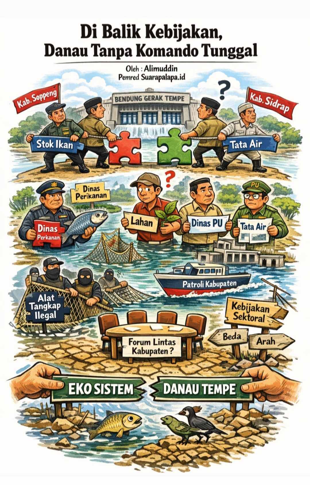 Hingga kini, pengelolaan Danau Tempe berjalan dalam pola sektoral: dinas perikanan berbicara soal stok ikan, dinas pertanian tentang lahan, dinas pekerjaan umum soal tata air, aparat penegak hukum soal pelanggaran alat tangkap. Semua bekerja. Tetapi tidak selalu dalam satu orkestrasi.