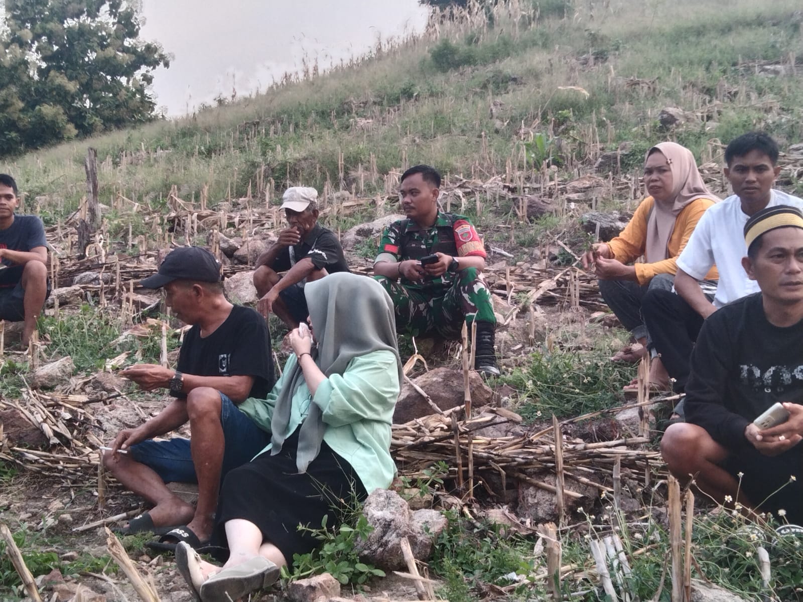 Sejumlah warga bersama Babinsa Desa Laringgi dan aparat desa duduk di lokasi kebun sengketa di Dusun Bera, Kecamatan Marioriawa, Kabupaten Soppeng, Jumat (27/03/2026), usai mencapai kesepakatan damai terkait batas tanah warisan melalui musyawarah dan pendekatan kekeluargaan.
