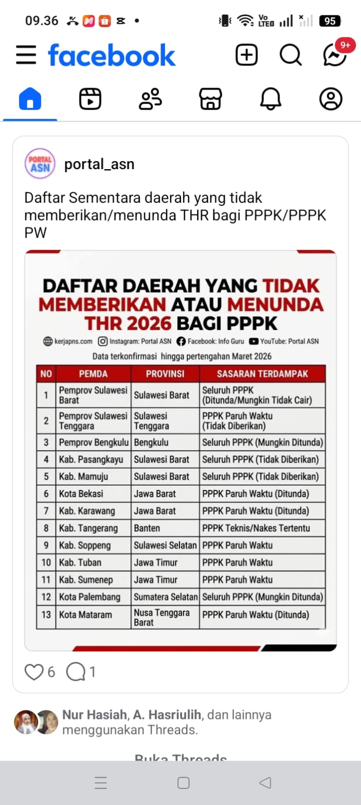 POTRET KETIDAKPASTIAN: Sebuah tangkapan layar dari akun Facebook portal_asn yang memperlihatkan daftar daerah yang tidak memberikan atau menunda THR 2026 bagi PPPK, termasuk Kabupaten Soppeng. Unggahan yang viral di WhatsApp dan media sosial lainnya ini kini menjadi perbincangan hangat dan sumber kritik bagi publik terkait prioritas kesejahteraan tenaga kontrak paruh waktu di Kabupaten Soppeng menjelang Idul Fitri 1447 H.