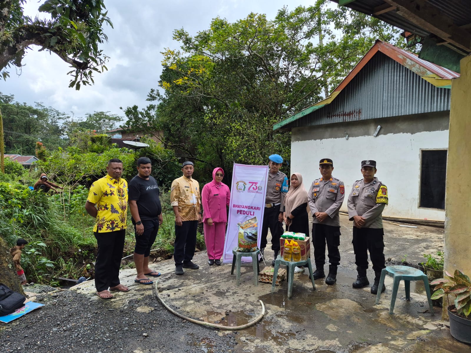 Di tengah suasana yang masih memulihkan diri itu, Kamis, 12 Maret 2026, sekitar pukul 10.30 WITA, sejumlah kendaraan berhenti di perkampungan warga. Beberapa personel kepolisian turun, membawa paket bantuan. Kedatangan mereka sederhana, tanpa keramaian yang berlebihan, tetapi cukup menarik perhatian warga yang perlahan berkumpul.