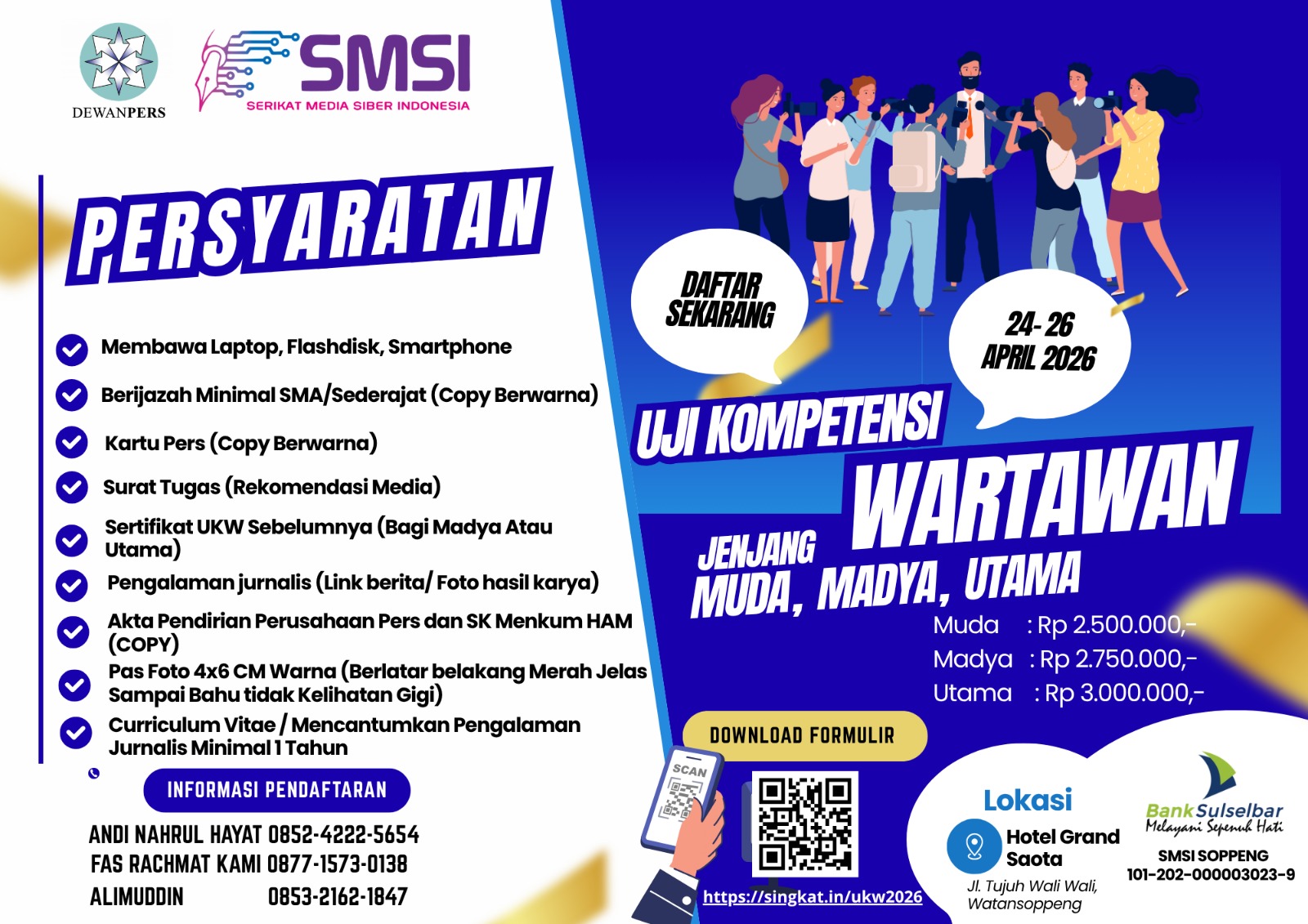 Upaya memperkuat kualitas dan profesionalisme insan pers kembali ditegaskan melalui pelaksanaan Uji Kompetensi Wartawan (UKW) yang digelar oleh Serikat Media Siber Indonesia bekerja sama dengan Dewan Pers. Kegiatan ini dijadwalkan berlangsung pada 24–26 April 2026 di Hotel Grand Saota.
