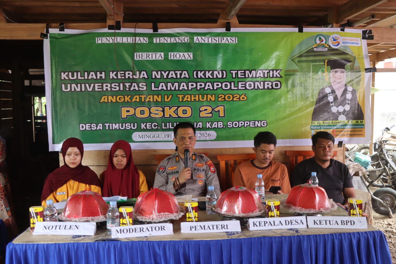 SINERGI EDUKASI: Kasi Humas Polres Soppeng, AKP H. Husain (tengah), saat memberikan materi dalam kegiatan Penyuluhan Antisipasi Berita Hoax yang bekerja sama dengan Mahasiswa KKN Tematik Universitas Lamappapoleonro Posko XXI di Desa Timusu, Kecamatan Liliriaja, Kabupaten Soppeng, Minggu (19/4/2026). Kegiatan ini bertujuan untuk meningkatkan literasi digital masyarakat agar lebih bijak dalam menyaring informasi di media sosial. (Foto: Dokumentasi Humas Polres Soppeng)