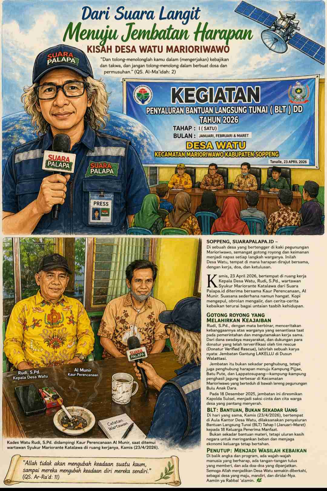 SOPPENG, SUARAPALAPA.ID — Pagi di Desa Watu selalu datang dengan kesederhanaan yang jujur. Angin dari lereng Bulu Anak Dara berembus pelan, membawa aroma tanah dan doa-doa yang tak pernah putus dari warganya. Di tempat inilah, harapan tidak hanya diucapkan, tetapi dirajut bersama, dengan kerja, kebersamaan, dan keyakinan.