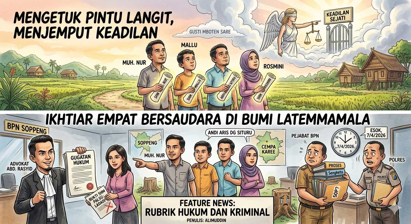 SOPPENG – Di balik rimbun kebun yang menjadi saksi bisu tetesan keringat para pendahulu, ada doa yang terus melangit dari empat bersaudara di Cempa Karee. Muhammad Nur, Andi Aris Daeng Situru, Mallu, dan Rosmini kini sedang menapaki jalan panjang nan terjal demi menjemput hak yang diduga “tercuri” oleh tangan-tangan tak berhak. Bagi mereka, tanah warisan di Kelurahan Manorangsalo bukan sekadar hamparan bumi, melainkan amanah suci yang harus dijaga kehormatannya hingga titik darah terakhir.