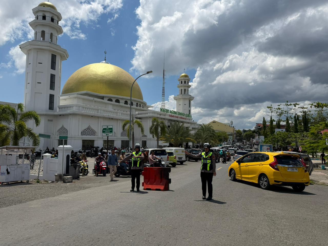 Suasana jalan raya di depan Masjid Agung Ummul Qura’ Sengkang, Kabupaten Wajo, Sulawesi Selatan. Terlihat personel Polsek Maniangpajo sedang melakukan pengaturan lalu lintas untuk mengurai kemacetan. Di latar belakang, tampak megahnya kubah emas Masjid Agung Ummul Qura’ di bawah langit yang cerah. (Foto: Dokumentasi Humas Polres Wajo)