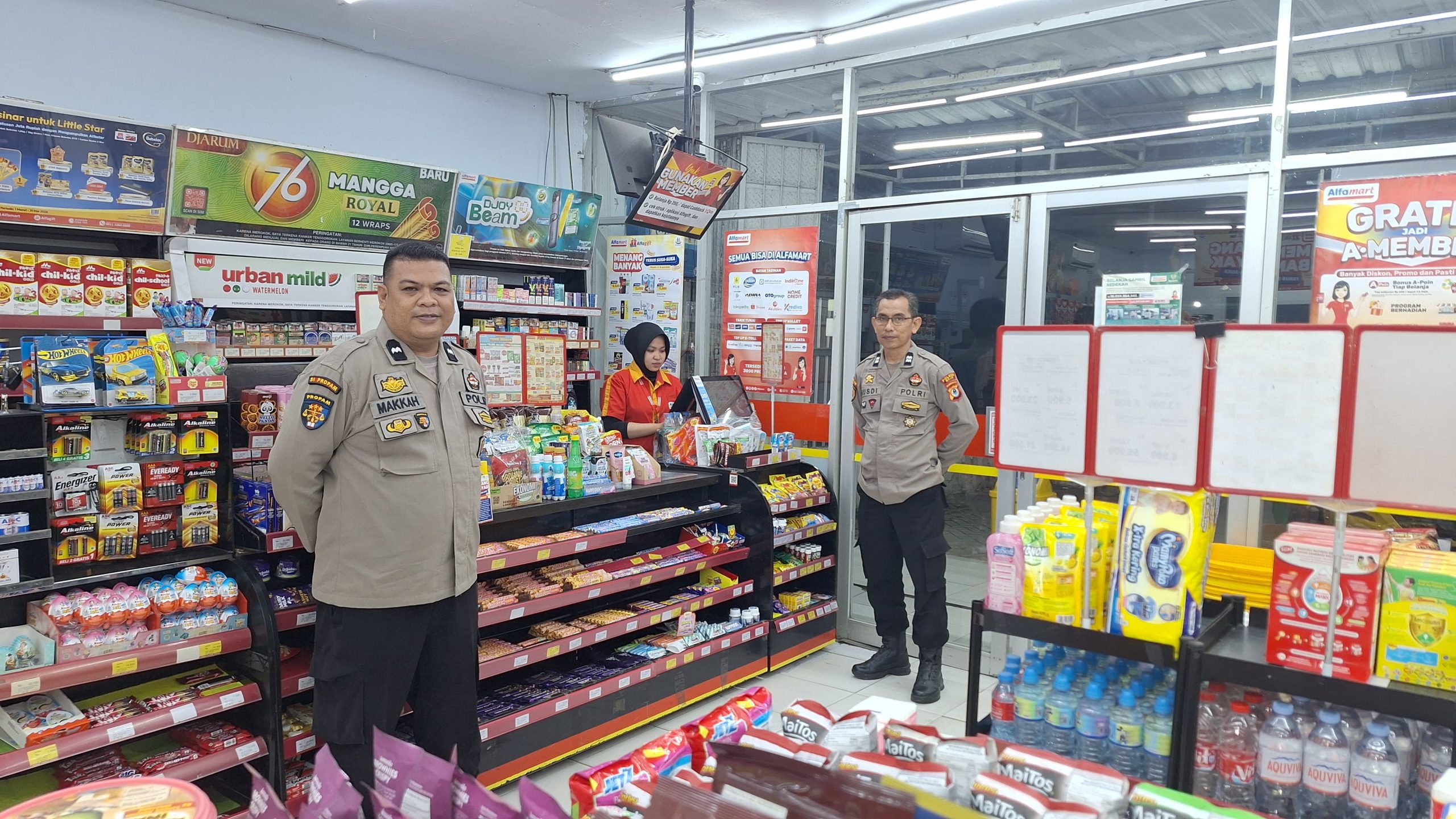 SIAGA DEMI KEAMANAN: Personel Polsek Maniangpajo, BRIPKA La Makah (kiri) dan AIPTU Muh. Rusdi (kanan), saat melaksanakan Patroli Blue Light di salah satu gerai minimarket di wilayah Anabanua, Sabtu (14/4/2026) malam. Kegiatan ini bertujuan untuk mengantisipasi tindak kriminalitas dan memberikan rasa aman kepada masyarakat di titik-titik rawan pada malam hari. (Foto: Dokumentasi Humas Polres Wajo)