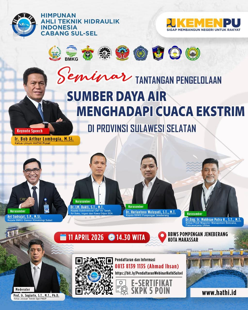 Poster seminar HATHI Sulawesi Selatan tentang tantangan pengelolaan sumber daya air menghadapi cuaca ekstrem, menghadirkan para pakar nasional dan daerah, yang akan digelar pada 11 April 2026 di Kota Makassar. (Foto: Dokumentasi BBWS Pompengan-Jeneberang)