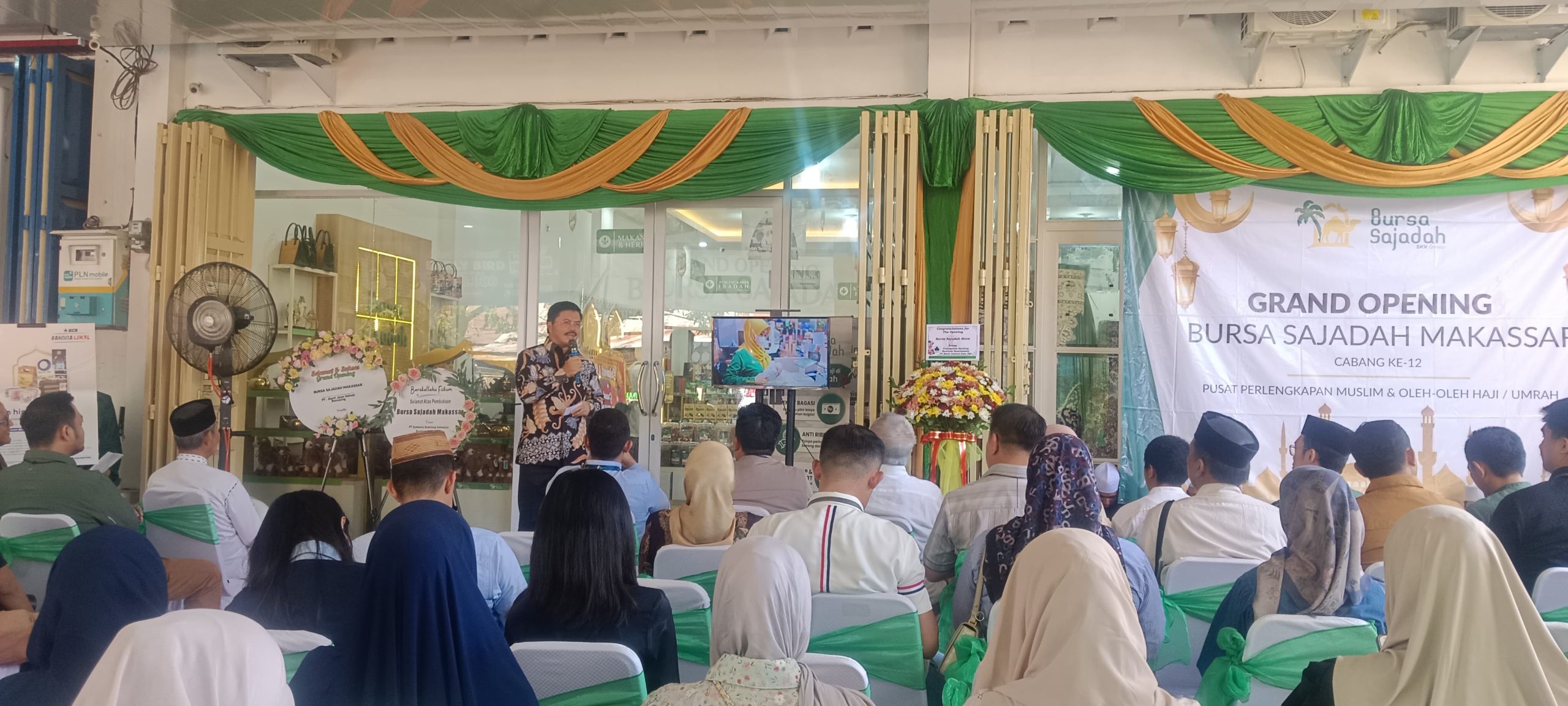 Dr. H. Muh. Aras, S.Pd., M.M. (Komisaris PT Jamkrindo sekaligus mitra pemilik Bursa Sajadah Makassar), saat memberikan sambutan pada acara Grand Opening Bursa Sajadah Cabang ke-12 di Kota Makassar. Kehadiran pusat perlengkapan muslim premium ini diharapkan menjadi oase bagi calon jamaah haji dan umrah dalam mempersiapkan perjalanan suci menuju Baitullah.