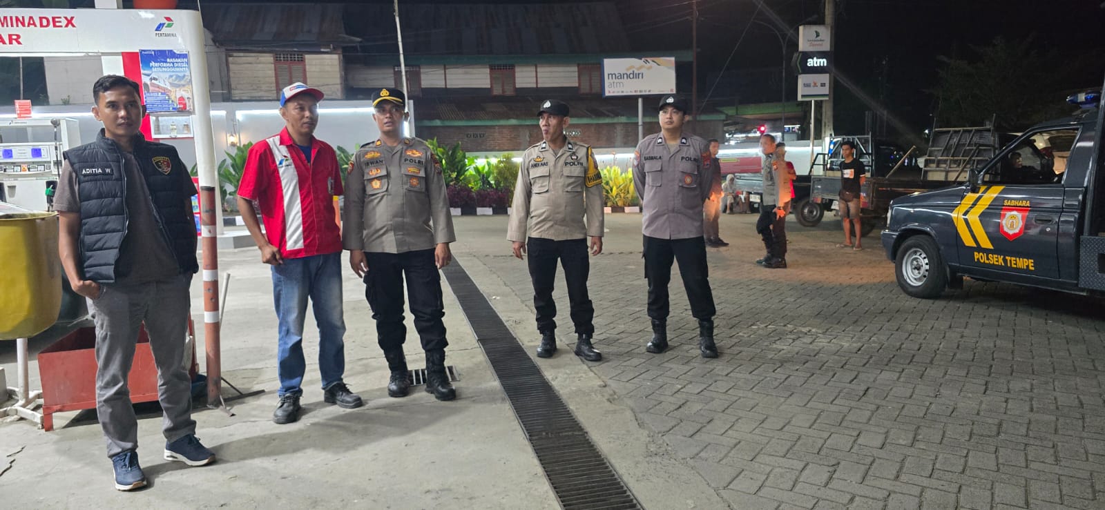 Personel Polsek Tempe dipimpin Kapolsek IPTU Irwan Taufik saat melaksanakan Patroli Biru di salah satu objek vital wilayah Kecamatan Tempe, Kabupaten Wajo, Sabtu (18/4/2026) malam, guna menjaga situasi kamtibmas tetap aman dan kondusif. (Foto: Dokumentasi Humas Polres Wajo)