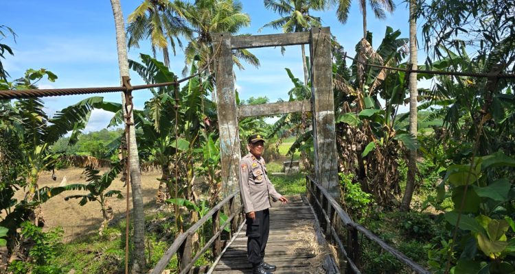 Keterangan Gambar: Seorang petugas kepolisian berdiri di atas jembatan kayu tua yang