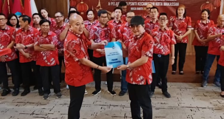 Keterangan Gambar: DISERAHKAN: Ketua PSMTI Sulawesi Selatan Thiawudy Wikarso menyerahkan dokumen pelantikan