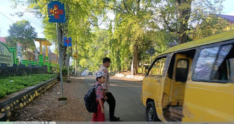Keterangan Gambar : Personel Polsek Lalabata saat membantu menyeberangkan seorang siswa sekolah
