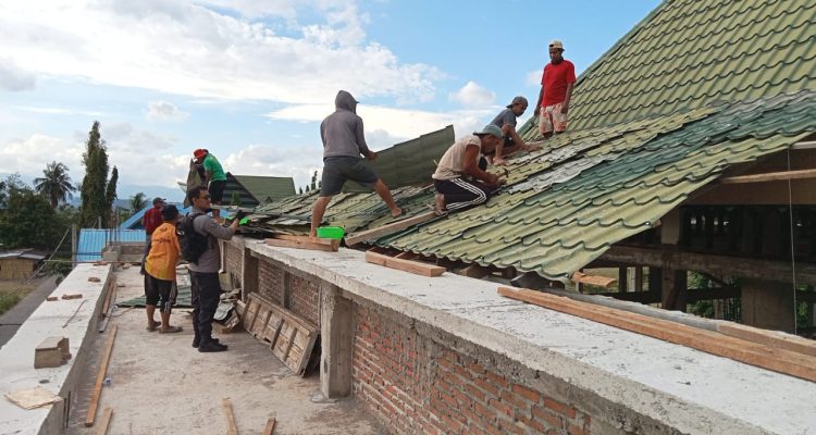 Keterangan Foto:Bripka Nasruddin, Bhabinkamtibmas Desa Citta, ikut memasang atap Masjid Nurul Jihad