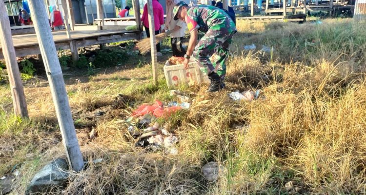 Keterangan Gambar Aparat gabungan membersihkan sampah dan saluran air di sekitar Pasar